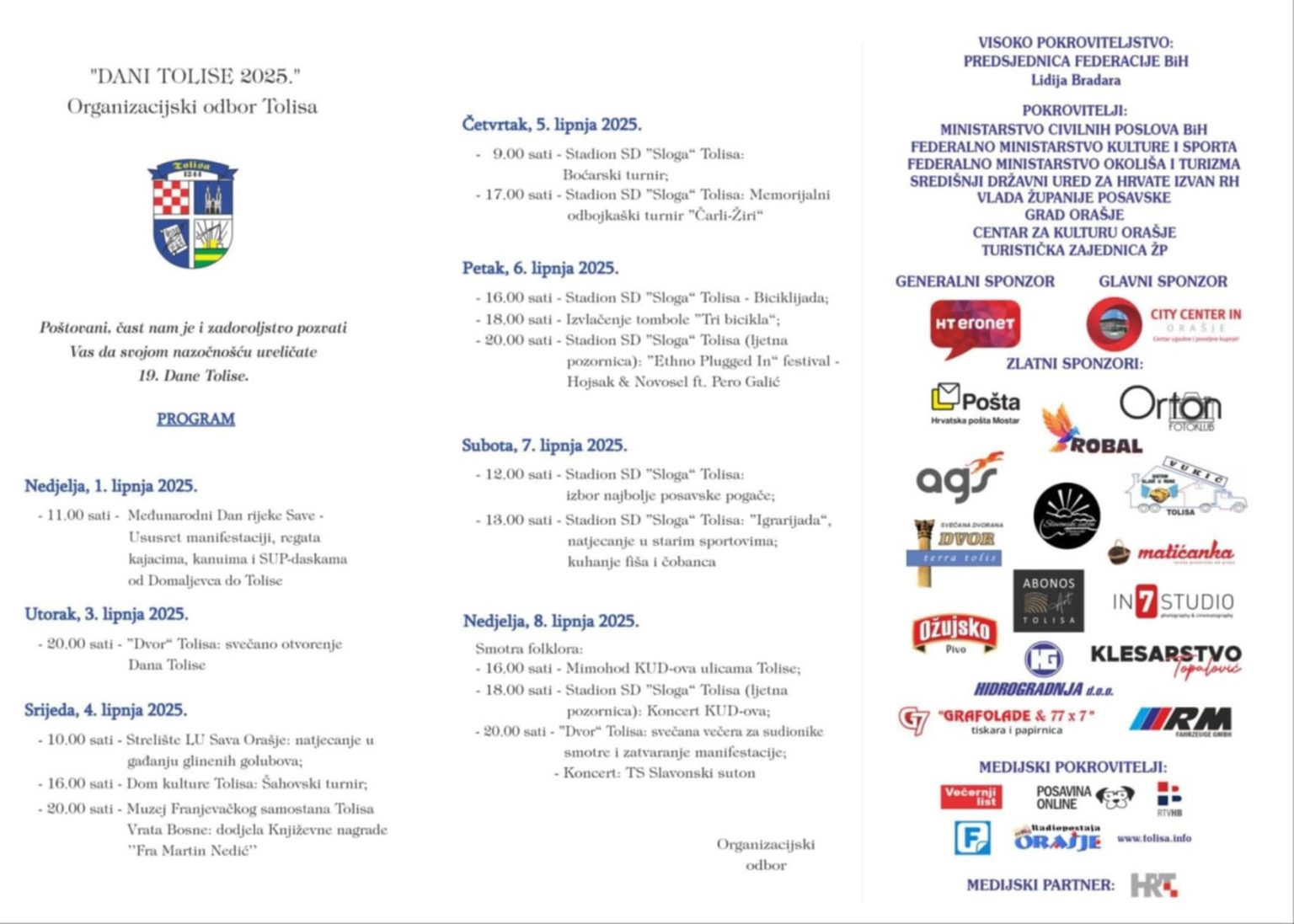 Zaklada Terra Tollis i Organizacijski odbor, pripremili su nam i ove godine bogat i sadržajan program koji će trajati do nedjelje 8. lipnja. Generalni sponzor je HT Eronet, a Glavni sponzor City Centar IN Orašje. Pokrovitelji manifestacije su Ministarstvo civilnih poslova BiH, Federalno ministarstvo kulture i sporta, Federalno ministarstvo okoliša i turizma, Središnji državni ured za Hrvate izvan RH, Vlada ŽP, Grad Orašje zahvaljujući kojima će i ove godine raspjevana Tolisa ugostiti brojne posjetitelje na organiziranim raznovrsnim sadržajima.